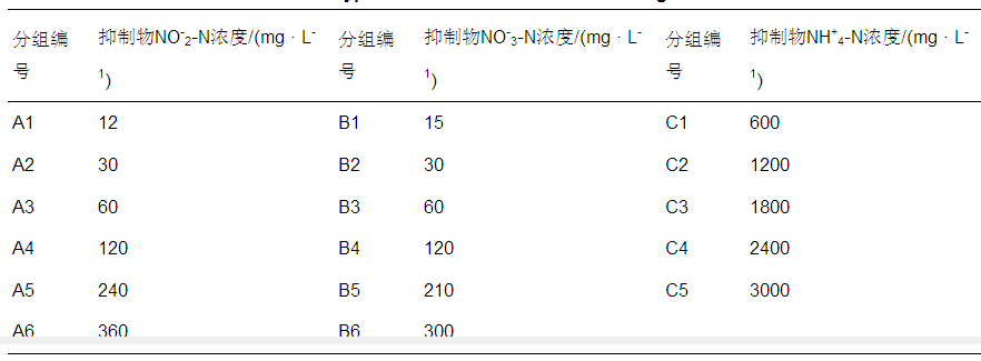 在100 mL血清瓶中加入60 mL配水,pH穩(wěn)定在7.3±0.3,分別向3組血清瓶中加入一定量的NaNO2、NaNO3和NH4Cl貯備液,具體抑制物質(zhì)及濃度情況見表 1.加入40 mL厭氧顆粒污泥,使用高純氮氣吹脫約5 min去除血清瓶中的溶解氧,密封后置于35 ℃恒溫水浴振蕩器中進(jìn)行培養(yǎng),每個濃度梯度設(shè)3個平行.