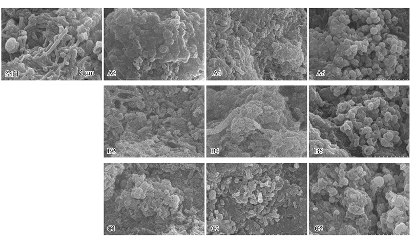 根據(jù)3.1節(jié)中的COD去除率變化選擇具有代表性的濃度組(A組:A2、A4、A6;B組:B2、B4、B6;C組:C1、C3、C5)進(jìn)行各項指標(biāo)的測定.圖 2為放大10000倍后的顆粒污泥的掃描電鏡圖.由圖 2可見,空白組厭氧顆粒污泥表面幾乎為8~25 μm長的桿狀菌,伴隨有少量的球菌,污泥表面凹凸不平孔隙交錯,是內(nèi)部微生物能量代謝的重要通道.在高濃度的亞硝氮、硝氮和氨氮(A6、B6和C5)作用下,厭氧顆粒污泥的表面結(jié)構(gòu)都發(fā)生明顯變化,污泥表面的主要細(xì)菌由桿狀菌變?yōu)榍驙罹?,幾乎不見桿菌.低濃度抑制作用下,污泥表面主要細(xì)菌為桿菌和球狀菌,且與空白組相比桿菌比例明顯降低.