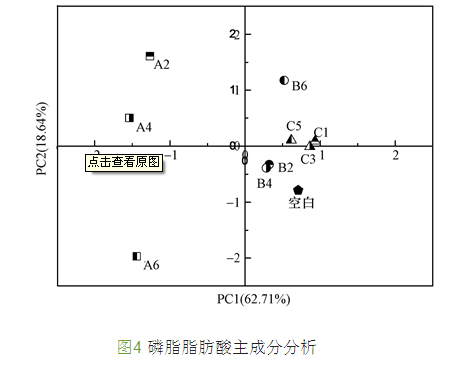 由圖 4可以看出,PC1反映了不同抑制物質(zhì)對PLFA的影響,PC2反映了不同抑制濃度對PLFA的影響.主成分分析顯示,各樣品間有較明顯的差異,A2、A4、A6、B6與空白之間的差異度較大,剩余樣品與空白之間的差異度相對較小.厭氧微生物的PLFA對亞硝氮的敏感度最高,即使低濃度的亞硝氮(A2)也會引起PLFA較大的變化;與亞硝氮不同,高濃度硝氮(B6)會引起PLFA較大變化,而低濃度(B2和B4)下與空白的差異度較小;氨氮(C1、C3和C5)對厭氧微生物PLFA的影響相對前兩者較小,且在濃度梯度上變化不大.