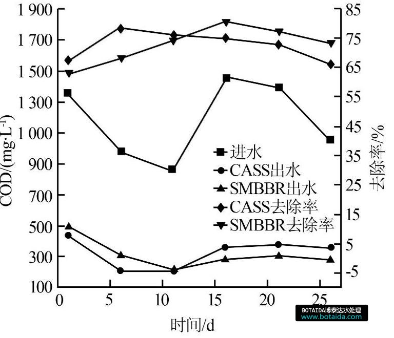CASS工藝和SMBBR工藝對COD的去除效果對比見圖2。