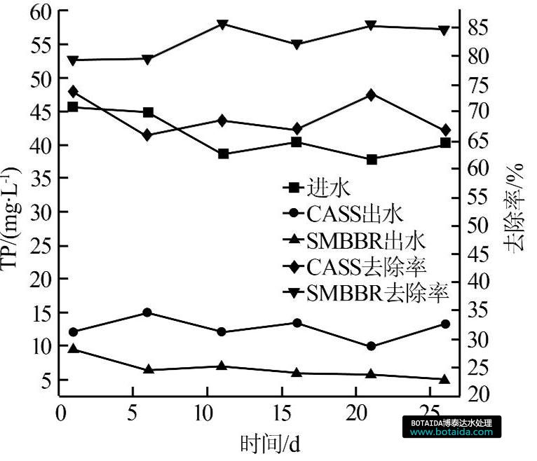 CASS工藝和SMBBR工藝對TP的去除效果對比見圖4。