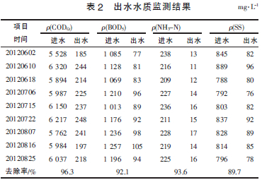 系統(tǒng)經(jīng)過2個月調(diào)試后,各項(xiàng)測試指標(biāo)均達(dá)到污水處理廠的接管標(biāo)準(zhǔn)。運(yùn)行結(jié)果表明,該系統(tǒng)運(yùn)行穩(wěn)定,抗沖擊負(fù)荷能力強(qiáng)。環(huán)保部門抽檢及企業(yè)自檢結(jié)果顯示,廢水各項(xiàng)指標(biāo)均穩(wěn)定達(dá)標(biāo)。近期運(yùn)行數(shù)據(jù)見表2。由表2 可見,廢水經(jīng)過“預(yù)處理-UASB-二級接觸氧化”工藝處理后,平均去除效率分別為CODCr96.3%,BOD5 92.1%,NH3-N 93.6%,SS 89.7%,出水監(jiān)測指標(biāo)均優(yōu)于接管標(biāo)準(zhǔn)。