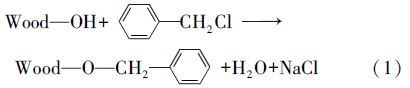 參照文獻(王東華等,2000)方法,在帶有攪拌機、溫度計和回流裝置的250 mL三口燒瓶中,加入20.0 g脫脂杉木粉和10% NaOH水溶液80~120 mL,攪拌均勻后讓其潤脹 30 min,然后加入 80~120 mL氯化芐和80 mL甲苯,攪拌下于110 ℃ 油浴中加熱反應(yīng)到設(shè)定時間,冷卻并加入少量水,抽濾,分別用50 mL 50%乙醇洗滌兩次,100 mL水洗滌兩次,再用50 mL 95%乙醇洗滌兩次,抽干,在60 ℃下干燥至恒重,得芐基化杉木粉,簡稱“芐基化木粉”,轉(zhuǎn)入干燥器中,并計算增重百分率(WPG).木粉芐基化改性的化學(xué)反應(yīng)式如下: