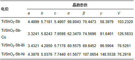 通過XRD分析軟件(X′Pert highscore plus)對數(shù)據(jù)進(jìn)行分析(晉勇等,2008)得到各電極的晶胞參數(shù)見表 1,分析表中數(shù)據(jù)發(fā)現(xiàn),對Ti/SnO2-Sb電極進(jìn)行金屬摻雜改性后,晶胞參數(shù)發(fā)生改變,主要體現(xiàn)在晶胞體積的增大或減小,這是由于各金屬離子成鍵半徑不同,當(dāng)金屬離子以固溶或者類質(zhì)同相的形式取代Sn4+進(jìn)入SnO2晶格內(nèi)部,必然引起金屬氧鍵的鍵長發(fā)生變化,從而造成晶胞參數(shù)的改變.XRD圖譜和晶胞參數(shù)等數(shù)據(jù)表明,通過金屬摻雜改性使金屬離子進(jìn)入到SnO2晶格中,其中,Cu和Ni以其p型半導(dǎo)體的性質(zhì)形成了空穴點位(劉淼等,2013),使電極表面形成較為密集的蜂窩狀,微觀結(jié)構(gòu)(圖 1)中也觀察到電極無裂縫且蜂窩狀結(jié)構(gòu)分布均勻,這樣的結(jié)構(gòu)可以增加電極的活性點位而提高電催化性能;而Bi則為n型半導(dǎo)體,與SnO2有著相似的性質(zhì),進(jìn)入SnO2晶格后主要通過增加自由電子的濃度來達(dá)到增強(qiáng)導(dǎo)電能力的效果.