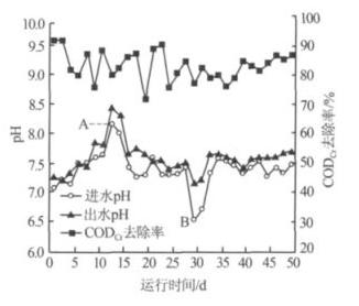 圖 3 進、出水 pH 及 CODCr 去除率隨運行時間的變化