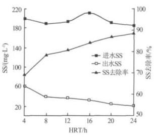 研究表明 HR T 對 SS 去除率有重要影響 〔5〕。 圖 4 為進、 出水 SS 及 SS 去除率隨運行時間的變化情況。