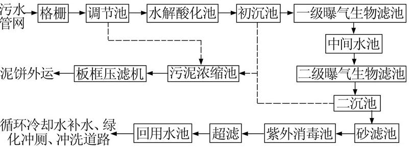 由于污水處理后主要供循環(huán)冷卻水系統(tǒng)補(bǔ)水,對(duì)水質(zhì)要求較高。水解酸化工藝可提高污水的可生化性。曝氣生物濾池(BAF)集生物氧化、截留懸浮固體為一體,具有抗沖擊負(fù)荷能力強(qiáng)、污泥產(chǎn)量較少、出水水質(zhì)穩(wěn)定等特點(diǎn)〔1, 2〕。超濾在過濾微細(xì)懸浮物及膠體物質(zhì)方面具有良好的效果〔3, 4〕,因此采用水解酸化—曝氣生物濾池—超濾組合工藝進(jìn)行處理,工藝流程如圖 1所示。從流程上分為3個(gè)部分: 預(yù)處理工藝、生化處理工藝和深度處理工藝。其中生化處理工藝為水解酸化—兩級(jí)曝氣生物濾池工藝,深度處理工藝為超濾工藝。