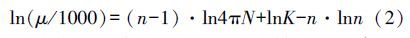 式中:μ為表觀黏度(mPa · s); N 為轉(zhuǎn)速(r · s-1); K為流體稠度系數(shù)(Pa · sn); n為流體流變指數(shù)(無(wú)因次).