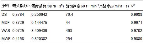根據(jù)式(2),測(cè)定不同轉(zhuǎn)速條件下的原料黏度,由冪律方程擬合得到4種發(fā)酵原料的流變特性參數(shù),如表 1所示.流變指數(shù)n是衡量實(shí)際流體與牛頓流體相似程度的指標(biāo).當(dāng)n為1時(shí),此時(shí)流體為牛頓流體;n小于1時(shí),流體為假塑性或者剪切變稀流體;n大于1時(shí),流體為膨脹塑性或者剪切增稠流體.從表 1中可以看出,4種原料的流變指數(shù)n都小于1,在 TS 為 5%、溫度為35 ℃條件下都為假塑性流體(陳志平等,2004).造成這4種原料呈現(xiàn)明顯的假塑性流體性質(zhì)的原因可能是污泥主要由微生物聚集體(即活性污泥菌膠團(tuán))、廢水帶入的無(wú)機(jī)性沉渣、少量未降的有機(jī)物等大分子物質(zhì)和大量的水分組成,污泥混合液中大分子物質(zhì)的存在會(huì)使原料在受到剪切后發(fā)生分子的重排,分子趨向與流動(dòng)方向一致,流動(dòng)阻力下降,從而使表觀黏度在剪切速率增大時(shí)減小(劉刈等,2009).4種原料中WAS的流變指數(shù)最小,剩餐的最大,這說(shuō)明在 TS 為 5%、溫度為35 ℃條件下4種原料中MWF的流變性質(zhì)最接近牛頓流體,而WAS偏離牛頓流體的程度最大.此外,4種原料中MDF的黏度最小,WAS的黏度最大,而流體稠度系數(shù)作為黏度的量度,使得通過(guò)擬合的得到的4種原料的流體稠度系數(shù)中MDF最小,WAS最大.
