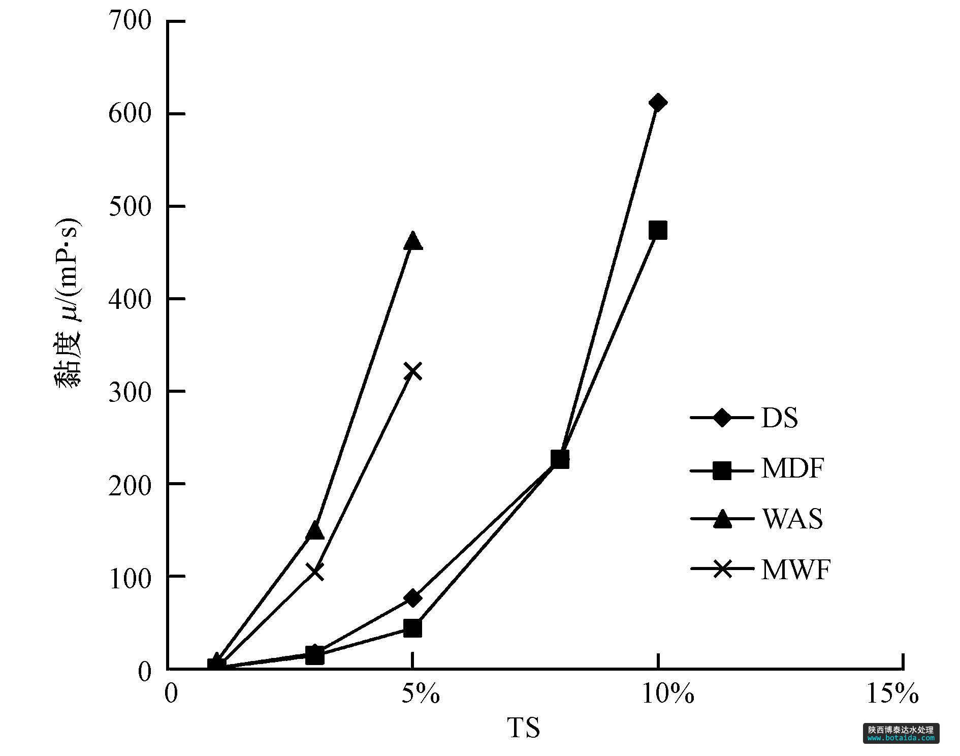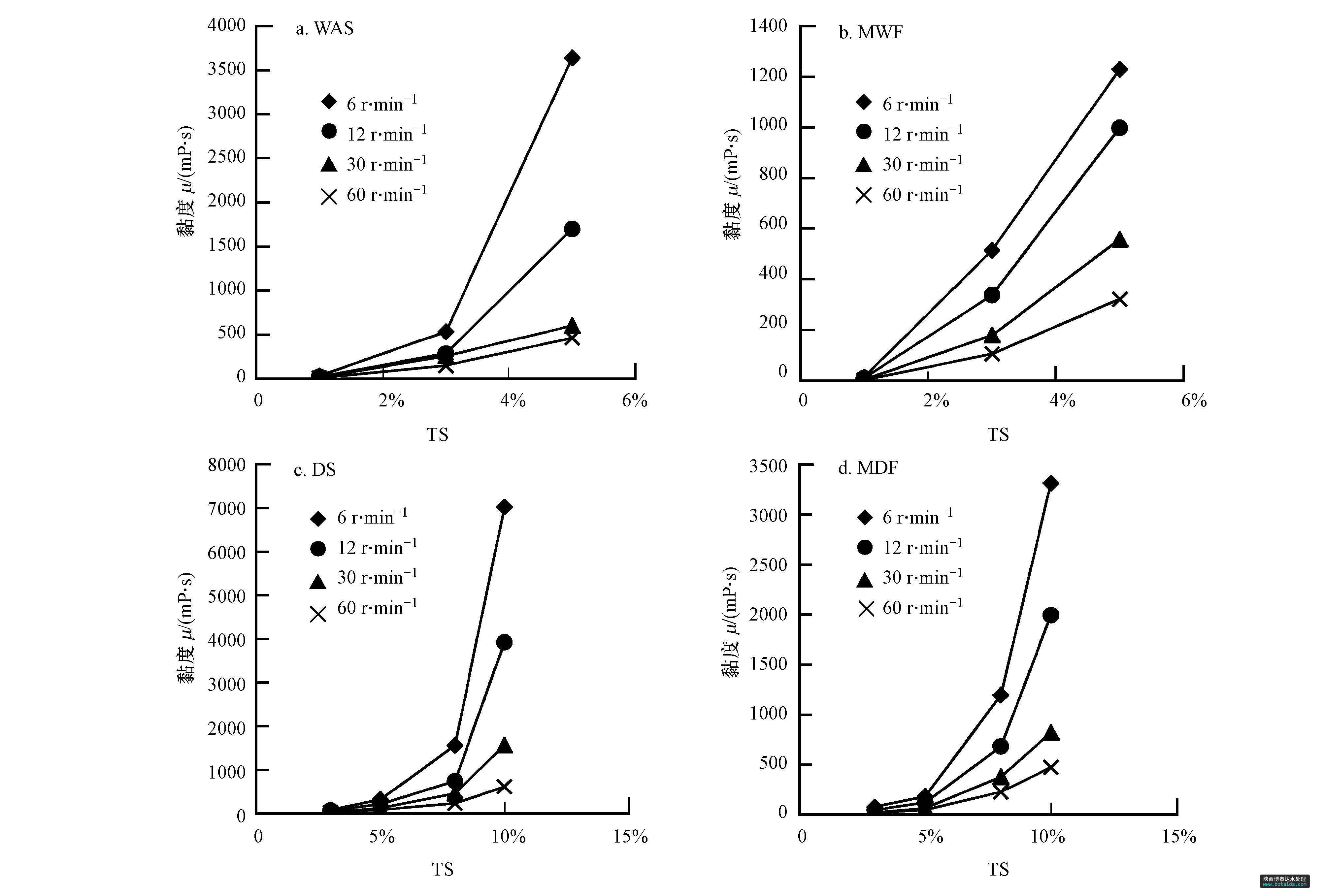 根據(jù)原料的起始 TS濃度,用蒸餾水分別將DS、DS與餐廚垃圾按TS 4 ∶ 1混合的混合物(the mixture of dewatered sludge and food waste,以下簡(jiǎn)稱MDF)配制成TS濃度分別為1%、3%、5%、8%和10%的混合液裝于500 mL 燒杯中;用恒溫水浴鍋控制混合液溫度為35 ℃,樣品經(jīng)過(guò)攪拌之后,用旋轉(zhuǎn)黏度計(jì)(NDJ5-S,中國(guó)上海)測(cè)量 4 個(gè)攪拌轉(zhuǎn)速(6、12、30、60 r · min-1)下的黏度,待讀數(shù)基本穩(wěn)定時(shí),每10 s 讀數(shù)1次,共讀取7個(gè)黏度值,取算術(shù)平均值.
