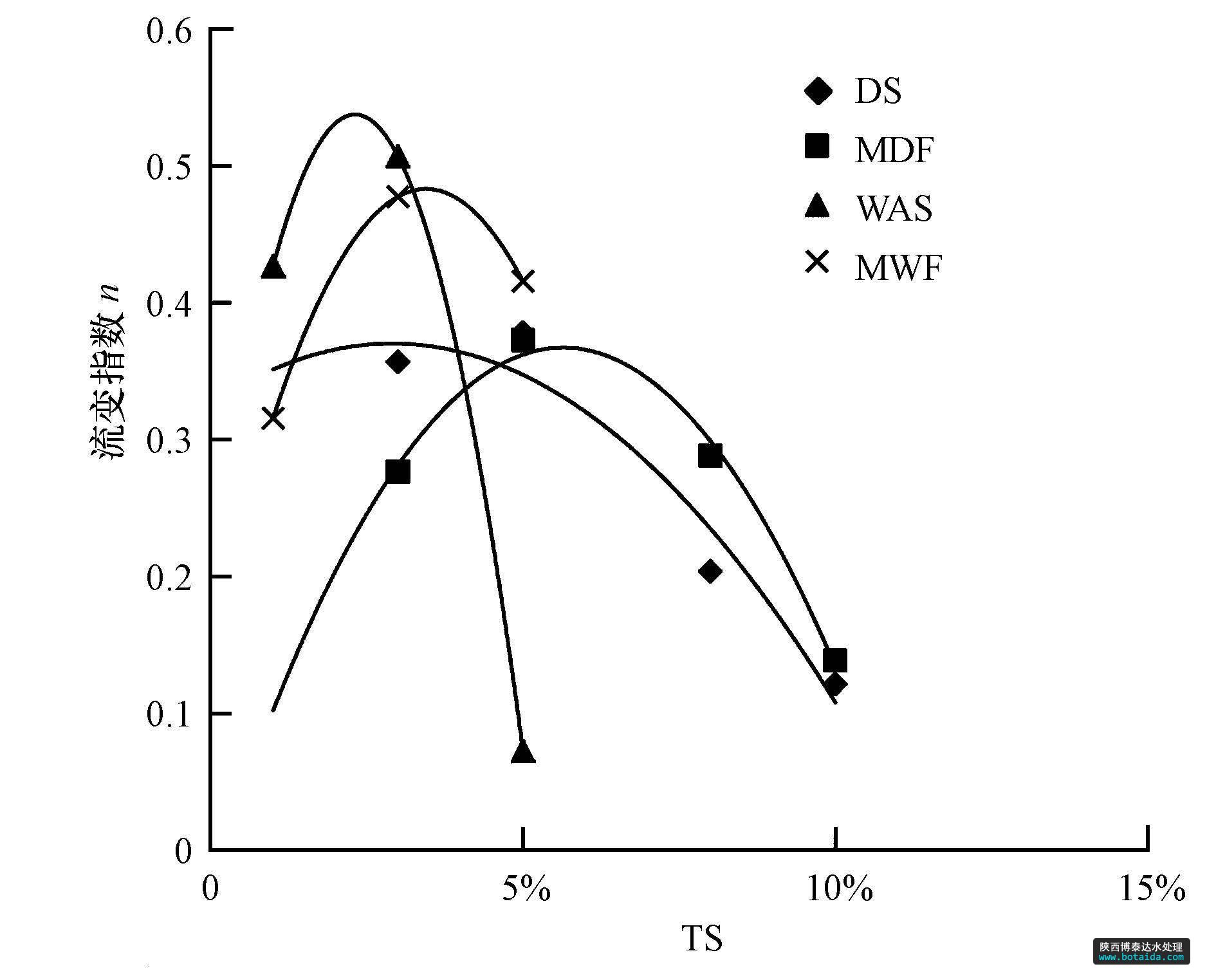 2)隨著固體濃度由1%升高到10%,4種厭氧消化原料的流變指數(shù)呈先升高后降低的趨勢(shì),WAS和MDF在TS=3%時(shí)流變指數(shù)最大,而DS和MDF在TS=5%時(shí)流變指數(shù)最大.