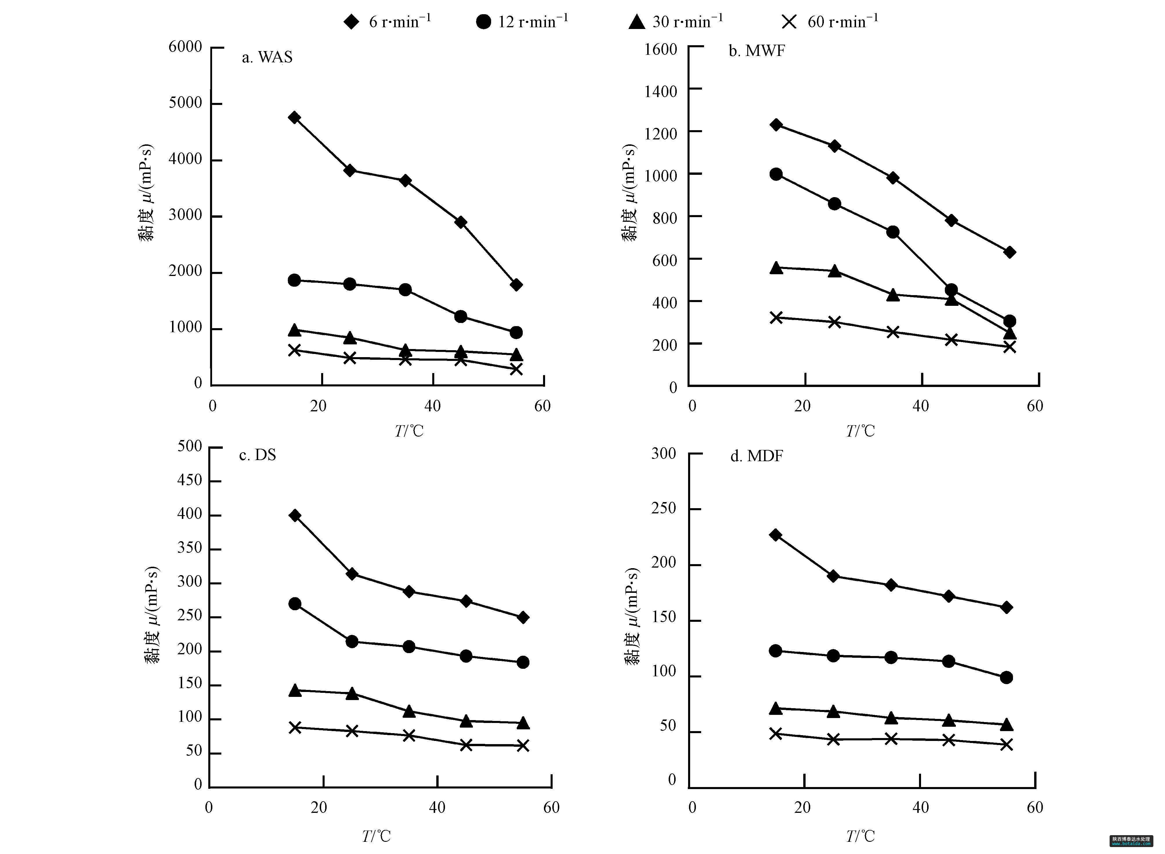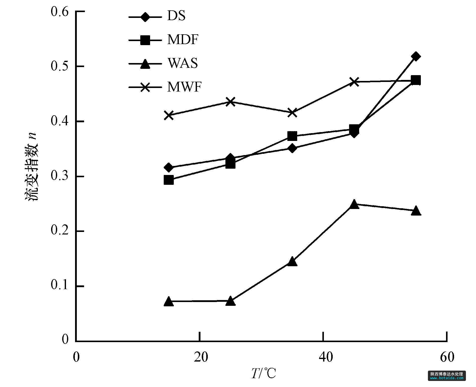 TS為5%時(shí)4種原料流變指數(shù)隨溫度的變化情況如圖 5所示.由圖 5可以看出4種原料的流變指數(shù)隨著溫度的升高而增大.這說(shuō)明溫度越高,這4種原料的流變性質(zhì)越接近牛頓流體.在這4種原料中,可以明顯的看出WAS的流變指數(shù)最小,偏離牛頓流體的程度最大;MWF的流變指數(shù)最大,最趨向于牛頓流體.通過(guò)對(duì)原始餐廚垃圾的流變特性分析,含水率為81.54%的未稀釋餐廚的黏度為1814 mPa · s,流變指數(shù)為0.6177,流變指數(shù)大于本文所研究的4種原料的任何1種;可能是餐廚垃圾較純污泥更趨向于牛頓流體,餐廚垃圾的加入導(dǎo)致污泥流變特性的改變,使得混合液較純泥更趨向于牛頓流體.DS的流變指數(shù)升高的幅度較大,其余3種原料升高的幅度較小.這說(shuō)明相對(duì)于其他3種原料,DS的黏度對(duì)溫度變化更敏感。