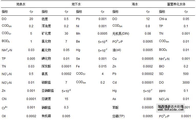 式(2)~(7)中,cj為指標(biāo)j的實測值或標(biāo)準(zhǔn)值;cj0為設(shè)定的指標(biāo)j的參照值,4類水體95項指標(biāo)的參照值cj0和室內(nèi)、外空氣29項指標(biāo)的參照值cj0分別如表 1和表 2所示.