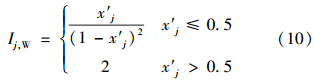 式中,Ij為由式(10)或式(11)計算得到的指標(biāo)j的引力指數(shù)值;wj為指標(biāo)j的歸一化權(quán)值,即滿足∑ m j=1 wj=1,它可以視實際問題需要,采用某種方法確定.一般情況下,只要各指標(biāo)的規(guī)范值x′j差異不大,可視各指標(biāo)為等權(quán)即可;但若最大指標(biāo)規(guī)范值x′j,max與最小指標(biāo)規(guī)范值x′j,min差異較大,則可采用如式(13)所示的對各指標(biāo)規(guī)范值x′j的線性加權(quán)計算權(quán)值.