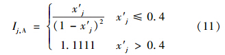 式中,x′j為指標(biāo)j的規(guī)范值;分母中(1- x′j)為環(huán)境樣本到設(shè)定的“參照級”樣本的規(guī)范距離;Ij為指標(biāo)j的環(huán)境質(zhì)量引力普適指數(shù);x′b為對不同類型的環(huán)境設(shè)置的指標(biāo)規(guī)范值的閾值.這是因為引力指數(shù)值Ij近似呈規(guī)范值x′j的三次冪增大,為了限制過大的x′j對綜合引力指數(shù)Ij的影響,而設(shè)置了閾值xb.xb一般設(shè)置為某類環(huán)境最嚴(yán)重污染等級的所有指標(biāo)規(guī)范值均值 ′j的1.1~1.3倍.因此,對水質(zhì)指標(biāo)分5級標(biāo)準(zhǔn),其最嚴(yán)重污染的第5級標(biāo)準(zhǔn)的所有指標(biāo)規(guī)范值均值 ′j5≈0.45,故取其均值的1.1倍,即取閾值x′b=0.5;而對空氣指標(biāo)分3級標(biāo)準(zhǔn),其嚴(yán)重污染的第3級標(biāo)準(zhǔn)所有指標(biāo)規(guī)范值均值 ′j3≈0.31,近似取其均值的1.3倍,即取閾值x′b=0.4.若污染物濃度的規(guī)范值x′j≥x′jb,則表明其對環(huán)境污染的危害程度已趨于飽和.從而得到4類水體的任一水質(zhì)指標(biāo)j的規(guī)范值x′j所表征水體樣本與指標(biāo)j的“參照級”樣本之間的引力指數(shù)公式如式(10)所示.