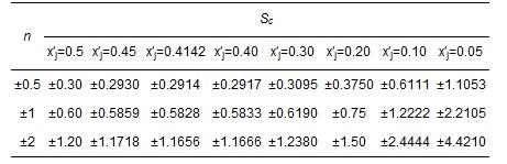 若n固定,將Sc對x′j求導(dǎo),并令S′c=0,得x′j=-1≈0.4142時,Sc有極小值0.5828n.由于變換式(2)~(7)中,對多數(shù)指標(biāo)只取n=±2、±1、±0.5.而公式(10)和式(11)中,x′j 取值范圍為x′j∈[0,0.5](對水體),x′j∈[0,0.4](對空氣).當(dāng)n為上述值時,x′j 分別取為如表 4所示值時,由式(21)計算得靈敏度Sc值如表 4所示.