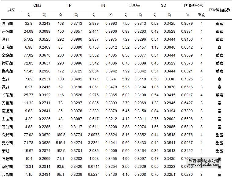 表 9 長江中下游45個湖泊富營養(yǎng)化指標(biāo)監(jiān)測數(shù)據(jù)cj及其規(guī)范值 x′j和引力指數(shù)公式評價結(jié)果