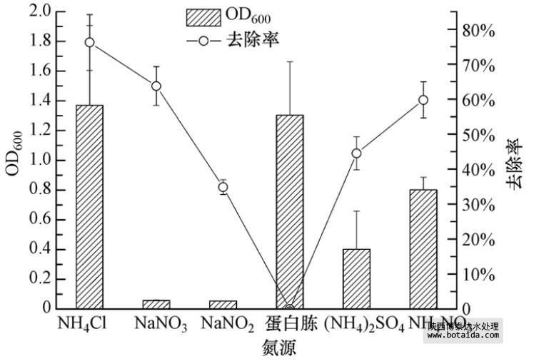 由此可知,聚磷菌ED-12菌株能夠在以NH4Cl、NaNO3、NaNO2、(NH4)2SO4、蛋白胨和NH4NO3為唯一氮源的培養(yǎng)基中生長(zhǎng).根據(jù)微生物生長(zhǎng)量、生長(zhǎng)周期及對(duì)PO3-4-P的去除率,NH4Cl是菌株ED-12生長(zhǎng)及發(fā)揮除磷能力的最佳氮源.