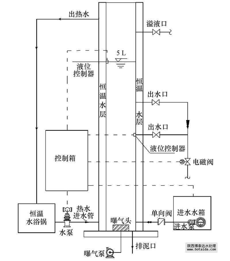 反應(yīng)器有效容積5 L,內(nèi)徑為100 mm,總高850 mm(圖 1).SBR運行參數(shù):自控裝置控制運行周期,處理水量為2.5 L · 周期-1,每周期6 h,包括進水5 min,曝氣240 min,靜沉75 min,排水10 min,靜置30 min;溫度(25.0±0.5)℃.進水水箱中設(shè)有循環(huán)泵,確保進水成份均勻.曝氣時控制反應(yīng)器內(nèi)DO≥2 mg · L-1.實驗過程中平均1天排1次泥,保證MLSS為5000 mg · L-1左右,污泥齡約為6 d.
