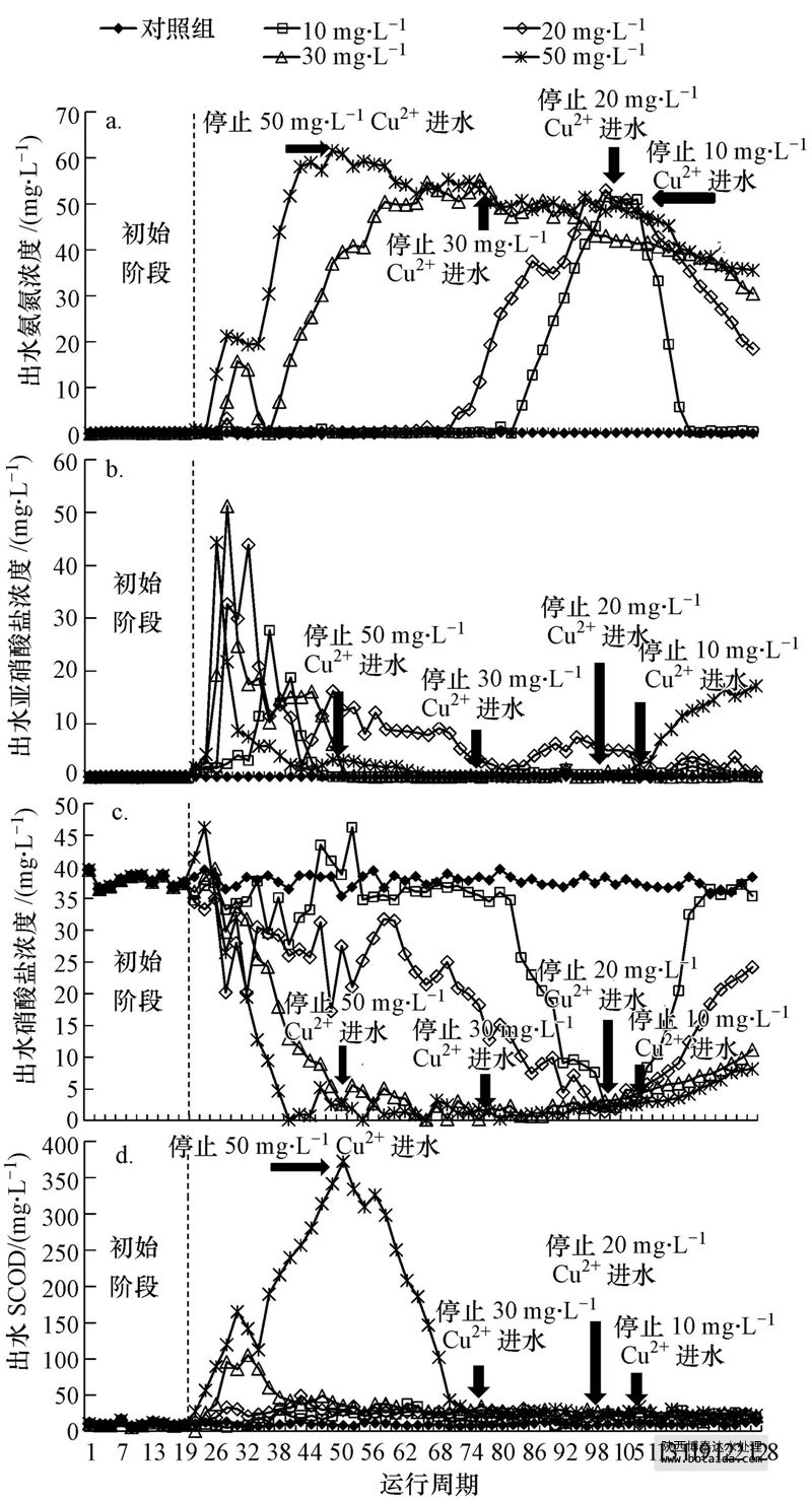 試驗采用5個相同的SBR反應(yīng)器進行持續(xù)負(fù)荷試驗.其中1個反應(yīng)器為對照體系,進水始終為不含Cu2+的模擬污水.另外4個反應(yīng)器在第1~20周期內(nèi)的進水為不含Cu2+的模擬污水,該階段為初始階段;第21周期后,4個反應(yīng)器的進水變?yōu)楹珻u2+濃度分別為10、20、30和50 mg · L-1的模擬污水,該階段為抑制階段;當(dāng)各反應(yīng)器的出水NH+4-N保持穩(wěn)定后,停止向進水中加Cu2+,系統(tǒng)進入恢復(fù)階段.