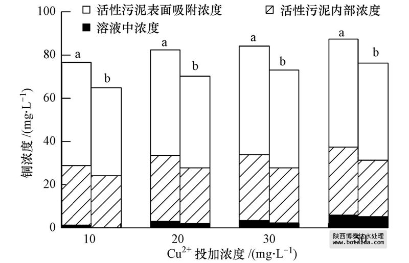 反應(yīng)器體系內(nèi)的總銅、溶解態(tài)銅、活性污泥內(nèi)部的銅、活性污泥表面吸附的銅可以反映銅在體系內(nèi)的分布,結(jié)合硝化作用的抑制可分析出銅對硝化細菌的影響.測定活性污泥內(nèi)部的銅主要運用洗脫液(1 mmol · L-1 EDTA,pH=7.0,0.1 mol · L-1 NaCl)洗脫泥樣后測定的方法.洗脫液使活性污泥表面吸附的銅解吸附,洗脫后殘留在泥樣內(nèi)的銅被認(rèn)為是進入細胞內(nèi)部的銅.將用洗脫液洗脫后的泥樣、過濾后的水樣、泥水混合樣加酸進行微波消解后,用火焰原子吸收儀測定銅的濃度,分別得到活性污泥內(nèi)部的銅、溶解態(tài)銅、總銅含量.總銅減去溶解態(tài)銅和活性污泥內(nèi)部的銅后可得到活性污泥表面吸附的銅.
