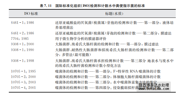 國(guó)際標(biāo)準(zhǔn)方法在被采納之前應(yīng)根據(jù)當(dāng)?shù)氐木唧w情況進(jìn)行評(píng)估??梢允褂靡呀⒌臉?biāo)準(zhǔn) 方法,如國(guó)際標(biāo)準(zhǔn)化組織(ISO)(見(jiàn)表7.11)的方法或效果及可靠性與其相當(dāng)?shù)姆椒ň刹?用。對(duì)于常規(guī)檢測(cè)可采用那些已建立的方法。無(wú)論選用何種方法檢測(cè)埃希氏大腸桿菌或耐 熱性大腸菌群,都必須考慮因環(huán)境或消毒劑受到損傷的微生物菌株的“復(fù)蘇”或“恢復(fù)”問(wèn)題。