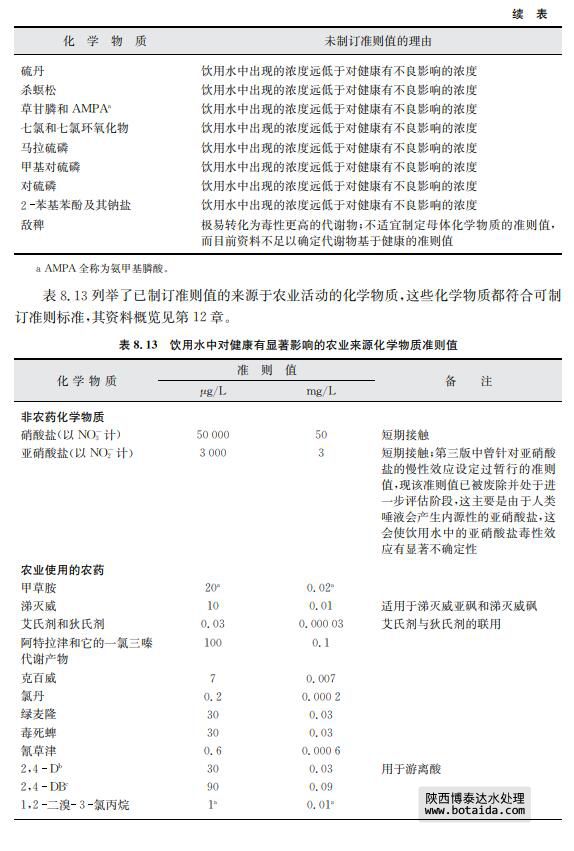 由于一些關(guān)于飲用水中存在化學物質(zhì)以及其穩(wěn)定性的文獻有明顯證據(jù)指出某些農(nóng)業(yè) 來源的化學物質(zhì)不會出現(xiàn)在飲用水中,對于此類化學物質(zhì)本準則不考慮建立準則值(見表 8.11)。