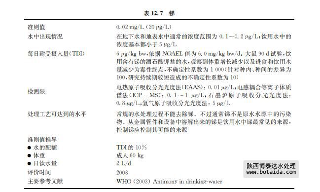 銻與銅、鉛和錫可合成硬質(zhì)合金。銻化合物有多種醫(yī)療用途,銻被認為是可作為焊料的 鉛的替代品,但沒有任何證據(jù)證明由此而污染飲用水(見表12.7)。來自環(huán)境、食物和飲用水 方面的接觸相對于某些職業(yè)的接觸要低得多。