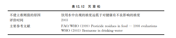 滅草松(CASNo.25057 89 0)是一種用于多種農(nóng)作物的廣譜除草劑。在土壤和水中 發(fā)生光降解作用,但在土壤中遷移性很強(qiáng),在環(huán)境中的持久性屬中等程度。曾有報(bào)道表明地 表水、地下水和飲用水中發(fā)現(xiàn)滅草松的濃度為數(shù)微克每升或更少。盡管滅草松在地下水中 存在并與水體有很高的親和性,但它在環(huán)境中似乎并沒有蓄積性。滅草松來(lái)自食物的暴露 量不會(huì)很高(見表12.12)。