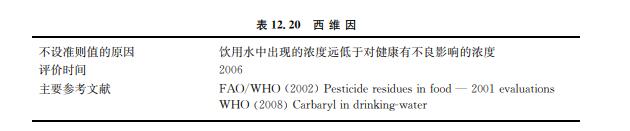 西維因(CASNo.63 25 2)是一種用于控制農(nóng)作物、樹木和觀賞植物害蟲的廣譜氨基 甲酸酯類殺蟲劑,它在公共衛(wèi)生和獸醫(yī)實(shí)踐中也有一些用途(見表12.20)。尚未有報(bào)道證明 飲用水中含有西維因,但它可能會(huì)經(jīng)滲流和噴灑進(jìn)入地表水。因此,除非在特殊情況下,通 過飲用水的接觸量是非常低的。普通人群中,攝入西維因的主要途徑是食物,但殘余量認(rèn)為 相對(duì)較低.