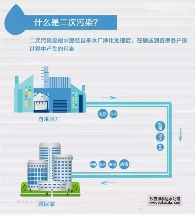 顧名思義,二次污染是指水源經自來水廠凈化處理后,在輸送到各家各戶的過程中產生的污染。主要是一些水管老化出現(xiàn)的鐵銹、泥沙、細菌、病毒等雜質和自來水廠氯制劑消毒后的副產物。二次污染的污染源主要有自來水管道、小區(qū)二次供水系統(tǒng)和水龍頭。