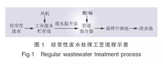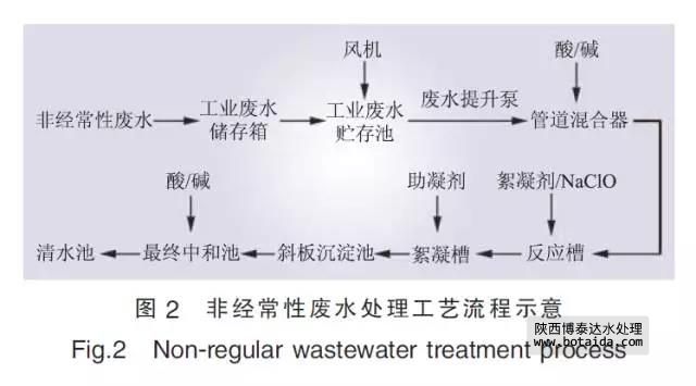 非經(jīng)常性廢水處理系統(tǒng)工藝流程如圖2所示, 調(diào)整pH值后的廢水先后經(jīng)過反應(yīng)槽、絮凝槽完成凝聚、絮凝反應(yīng), 然后進入斜板沉淀池完成絮凝體與水的分離。沉淀池上部的清水自流進入最終中和池進行pH值調(diào)整, 最終出水流入清水池, 與經(jīng)常性廢水匯總。