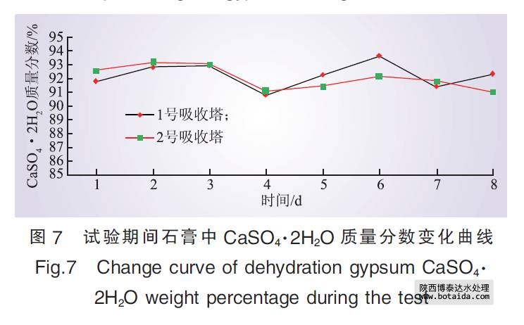 根據(jù)計劃進行臨時管路系統(tǒng)安裝, 從原工業(yè)廢水系統(tǒng)清水池清水泵出口母管直接引出一路管道至1、2號脫硫塔間的地坑。由電廠原有的坑泵將處理后的工業(yè)廢水輸送入脫硫塔工藝用水點, 同時在管路上增設(shè)電動調(diào)節(jié)閥和電磁流量計。首次補入地坑120 m3處理后的工業(yè)廢水, 待地坑內(nèi)坑泵開啟將其輸送至脫硫系統(tǒng)后, 監(jiān)測脫硫塔脫硫效率、石膏品質(zhì)變化; 在脫硫塔脫硫效率、石膏品質(zhì)穩(wěn)定無變化的情況下, 逐步補入處理后的工業(yè)廢水, 并以10 m3/d的梯度逐漸增加。若石膏品質(zhì)明顯下降, 則加大監(jiān)測頻率, 分析原因, 同時停止補入處理后的工業(yè)廢水。在調(diào)試好相關(guān)設(shè)備和儀表后開始進行試驗分析, 內(nèi)容包括脫硫系統(tǒng)整體運行狀況、脫硫效率、石膏品質(zhì)等。