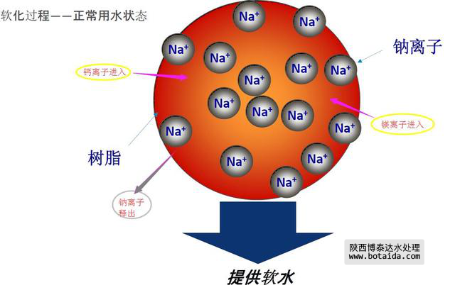 當(dāng)水中的鈣鎂離子含量高時,離子交換樹脂可以釋放出鈉離子,功能基團(tuán)與鈣鎂離子結(jié)合,這樣水中的鈣鎂離子含量降低,水的硬度下降。硬水就變?yōu)檐浰?,這是軟化水設(shè)備的工作過程。