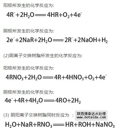 在利用滲析的極化過程中,由于在水溶液中會(huì)產(chǎn)生H+和OH-,使樹脂在化學(xué)反應(yīng)中進(jìn)行電化學(xué)再生,這對(duì)水質(zhì)的提升具有正面的影響,而在再生的過程中,如果不進(jìn)行離子交換處理,就會(huì)造成水質(zhì)變壞,這樣就需要采用適宜的工作環(huán)境,才能達(dá)到提高水質(zhì)的要求,采用EDI裝置的離子交換樹脂技術(shù),可以有效的提高水質(zhì)。具體的化學(xué)反應(yīng)方程式如下,