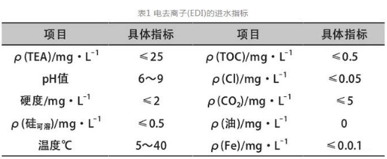 EDI 裝置在電廠中得到了廣泛的應(yīng)用,它屬于較為精細(xì)的水處理系統(tǒng),在水處理的過程中,必須要求進(jìn)水有較高水質(zhì),才能滿足處理的要求。在一般情況下EDI 對(duì)進(jìn)水水質(zhì)的要求具體如表1 所示,主要采用RO 作為火電廠的廢水預(yù)脫鹽軟化處理設(shè)備。