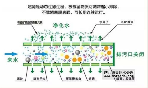 自來水從濾芯端面進入到超濾膜內(nèi)后,在正常水壓的作用下,凈水從超濾膜管壁滲出,而泥沙、鐵銹、膠體、細菌、懸浮物、大分子有機物等有害物質(zhì)被截留在超濾膜管內(nèi),并在用戶使用直通自來水或?qū)V芯進行沖洗和反沖洗時從直通自來水出口排出。