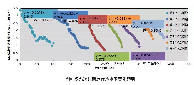 ① 透水率穩(wěn)定性透水率(J25/△P)是衡量膜滲透性能的主要指標(biāo)。以透水率隨運行時間的衰減速率作為膜系統(tǒng)運行穩(wěn)定性的評價指標(biāo),方法是:通過線性擬合分析得到每次維護(hù)性清洗(MC)后的起始透水率,再將每個恢復(fù)性清洗(RC)周期內(nèi)的起始透水率進(jìn)行線性回歸得到每個RC周期內(nèi)的透水率衰減速率,見圖3。
