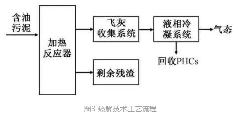 在無氧條件下,含油污泥經(jīng)高溫熱解轉化為氣、液、固三相,氣相產(chǎn)品以CH4、CO2、H2和CO為主,液相一般為常溫燃油和水,固相殘渣中含有焦炭,一般以回收液態(tài)PHCs為主,可不調質達到回收目的。熱解反應在還原氣氛下進行,產(chǎn)二噁英極少,其典型工藝流程如圖3所示。