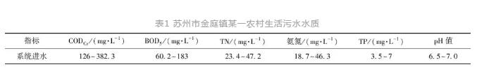 采用鐵碳-砂濾組合進行強化除磷,相比化學(xué)法,操作簡單,維護量小,從而為鐵碳-砂濾的深度除磷工藝在農(nóng)村生活污水中的應(yīng)用,一級脫氮除磷強化提供解決思路。為分析鐵碳-砂濾除磷工藝實際工程中的除磷效果,將該工藝應(yīng)用于蘇州市金庭鎮(zhèn)某一農(nóng)村生活污水處理項目。該項目污水處理系統(tǒng)采用固定床生物膜工藝,為防止鐵碳板結(jié)鈍化,裝置通過特殊結(jié)構(gòu)設(shè)計,通過機械方法使鐵碳運動,互相摩擦去除氧化膜,避免長時間電解過程中陽極鈍化及鐵碳板結(jié)問題。項目區(qū)生活污水水質(zhì)情況如表1所示。