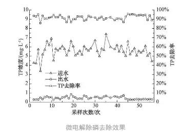微電解除磷去除效果如下圖所示, 進水 TP 濃度為3.5~7 mg/L,平均濃度為5.64 mg/L。當進水TP濃度為3.5~5 mg/L時,出水TP濃度穩(wěn)定于0.5 mg/L以下,達到一級A標準;當進水TP濃度在5~7 mg/L時,出水TP濃度穩(wěn)定小于1 mg/L,達一級B標準;平均去除率為91.84%~95%。項目試驗結(jié)果表明,微電解除磷-砂濾技術(shù)可有穩(wěn)定高效的除磷效果,出水TP穩(wěn)定達標。