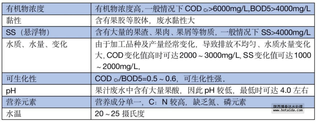 果汁廢水主要來(lái)自沖洗水果、粉碎、榨汁等工序,罐裝工段的洗瓶、滅菌、破瓶損耗和地、面沖洗等環(huán)節(jié)。廢水中含有較高濃度的糖類、果膠、果渣及水溶物和纖維素、果酸、單寧、 礦物鹽等。